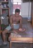 Opleidingskamp Papoea Vrijwilligers Korps: leerling slijpt schoenzool bij schoenmakerijmachine