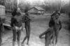 Vrouwen en kinderen uit de Asmat voor huis op palen
