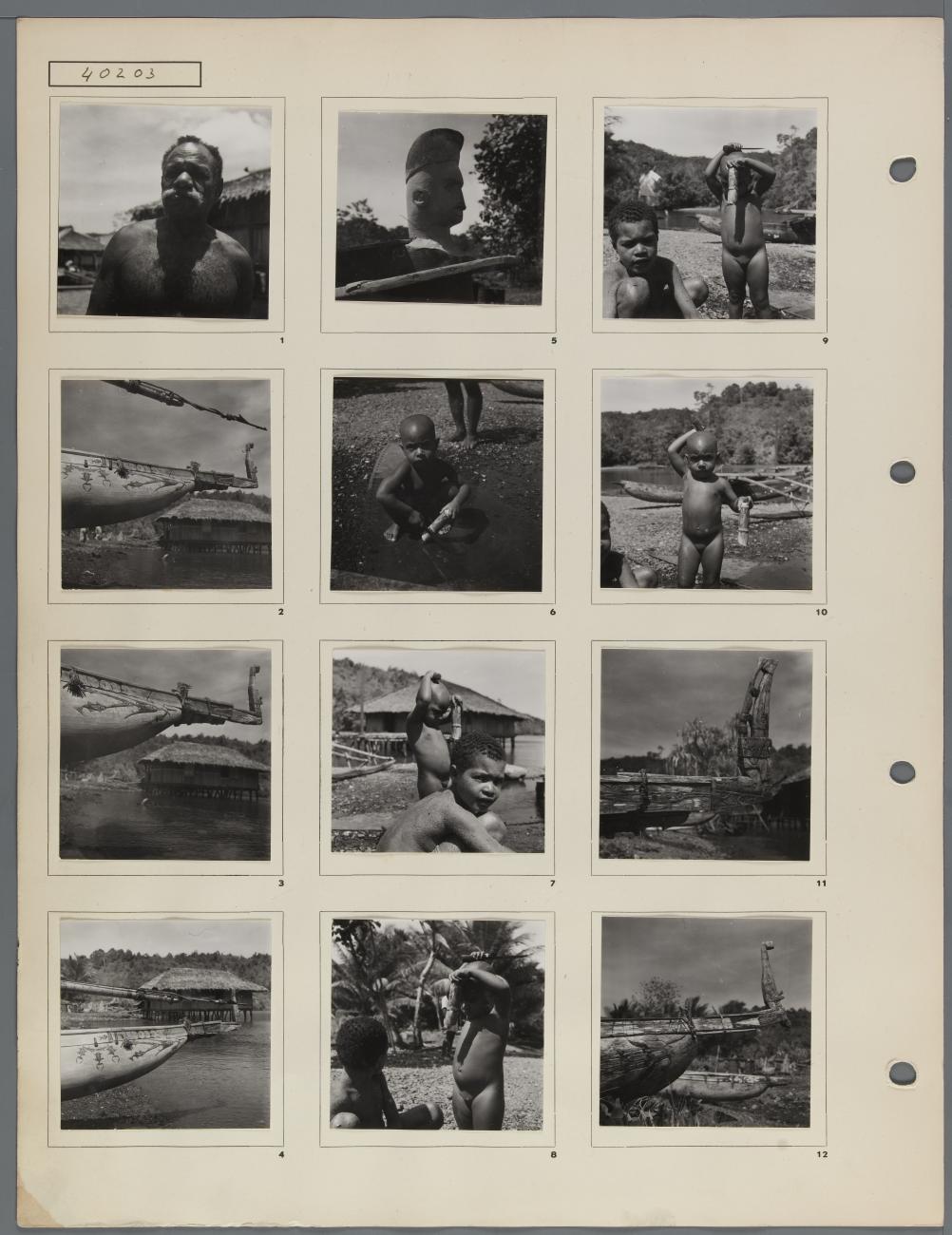 Depapre, inwoners en prauwversieringen - Foto 1 : portret Papoea man met snor.Foto 2 t/m 5 : versierde onderdelen van een prauw.Foto 7 t/m 10 : portretten Papoea kinderen.Foto 11 en 12 : versiering prauw.