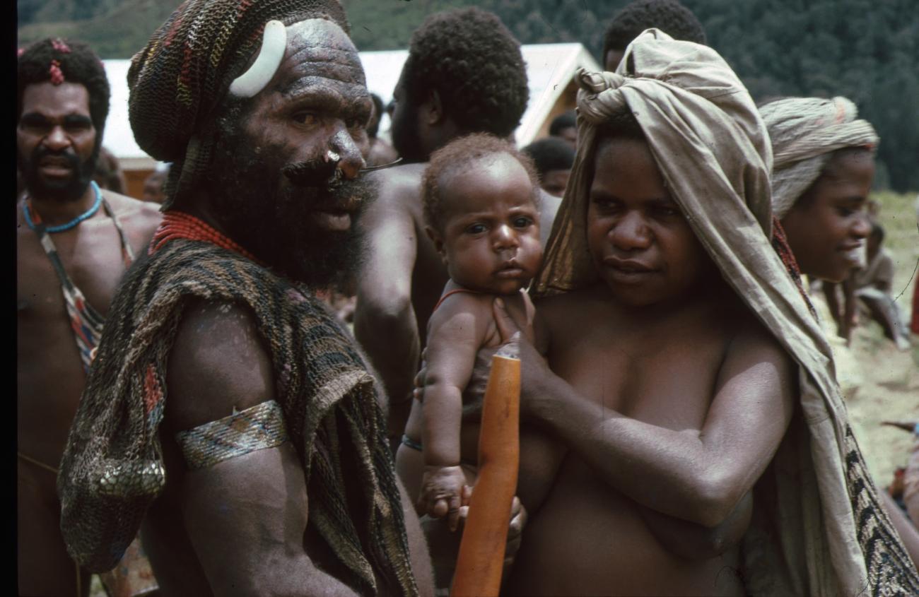 Papuaman and woman in traditional dress with baby on her arm