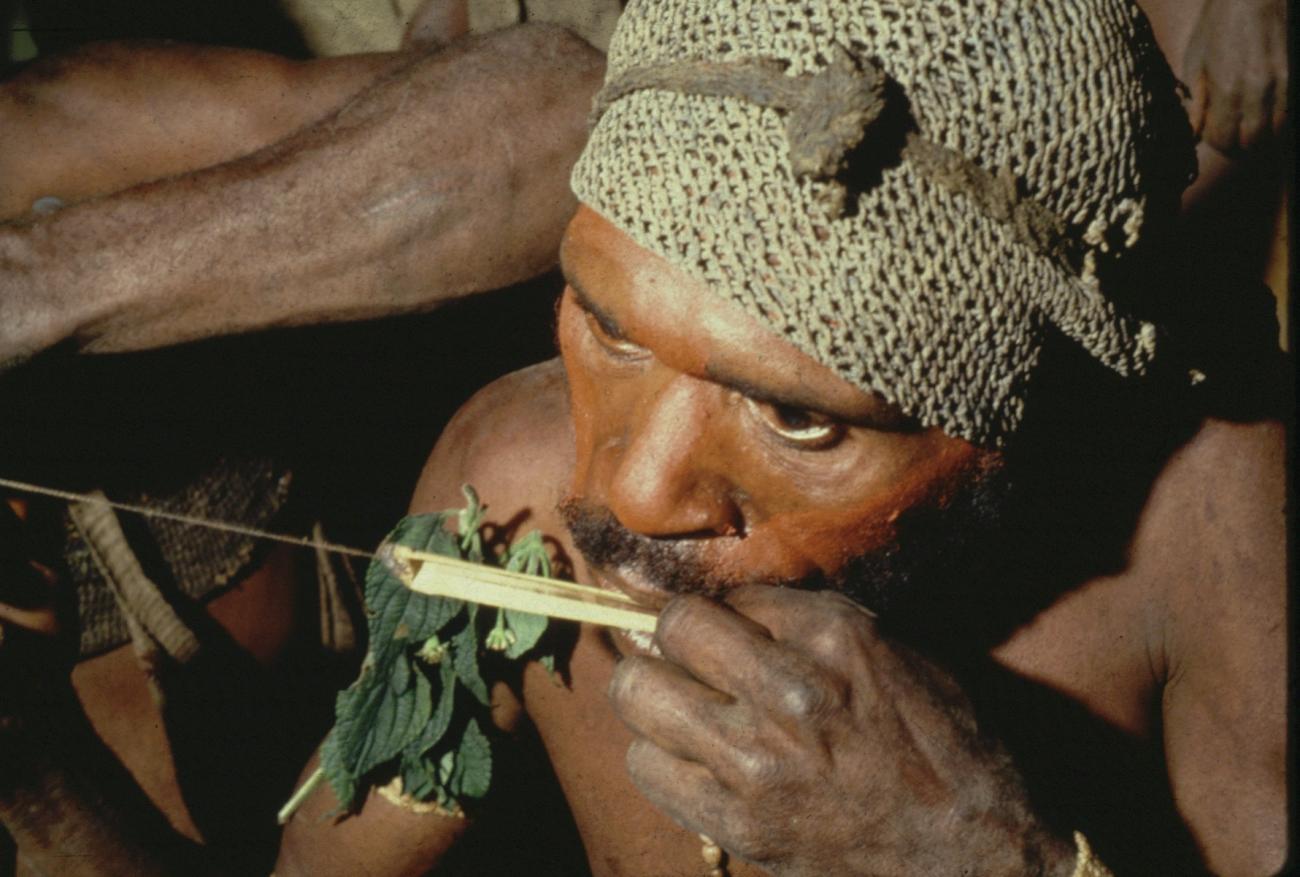 Man bespeelt een mondharp, iemand anders trekt aan het touwtje