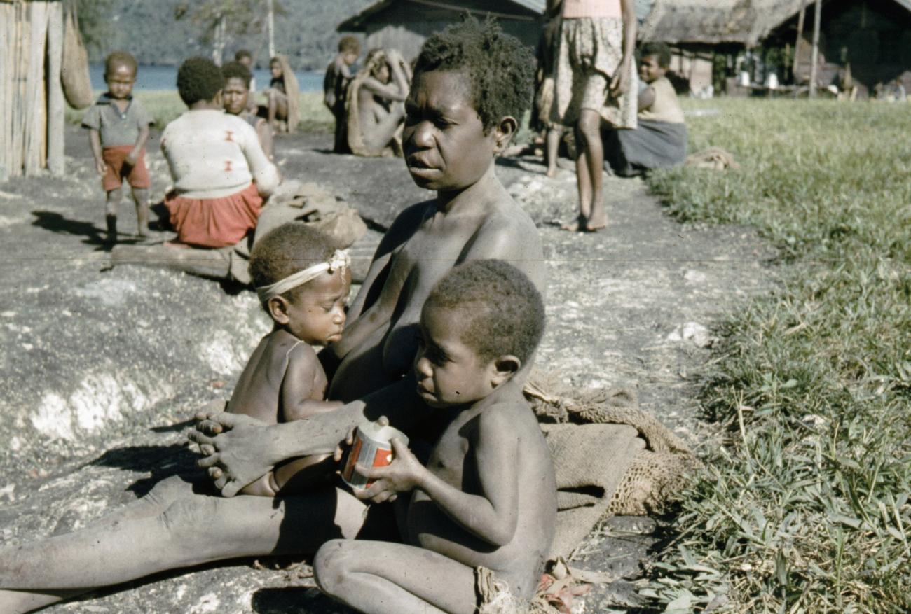 Ekari, kleurenpositief, vrouwen, kinderen, huizen