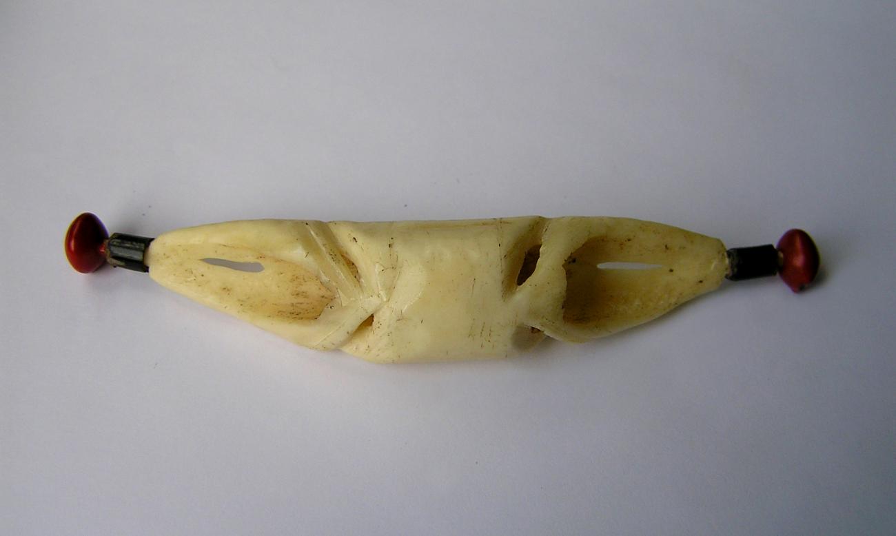 De neusversiering is snijwerk van een bot. De uiteinden zijn versierd met een hol stukje pen van een casuarisveer met een rode abruszaden.