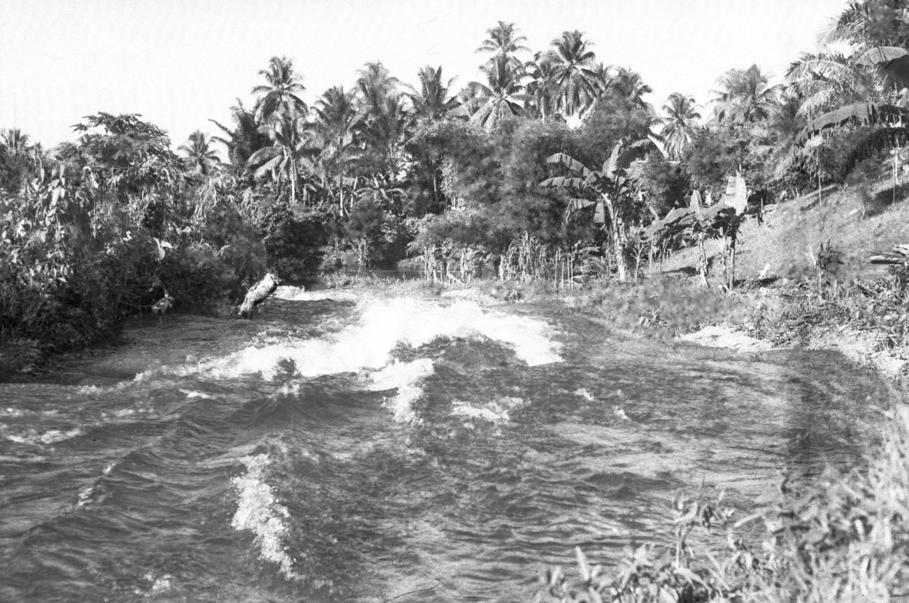 Stroomversnelling bij hoge rivieroever en palmbomen