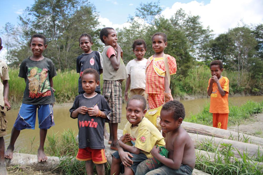 groepje kinderen poseren naast beek in de Baliemvallei.