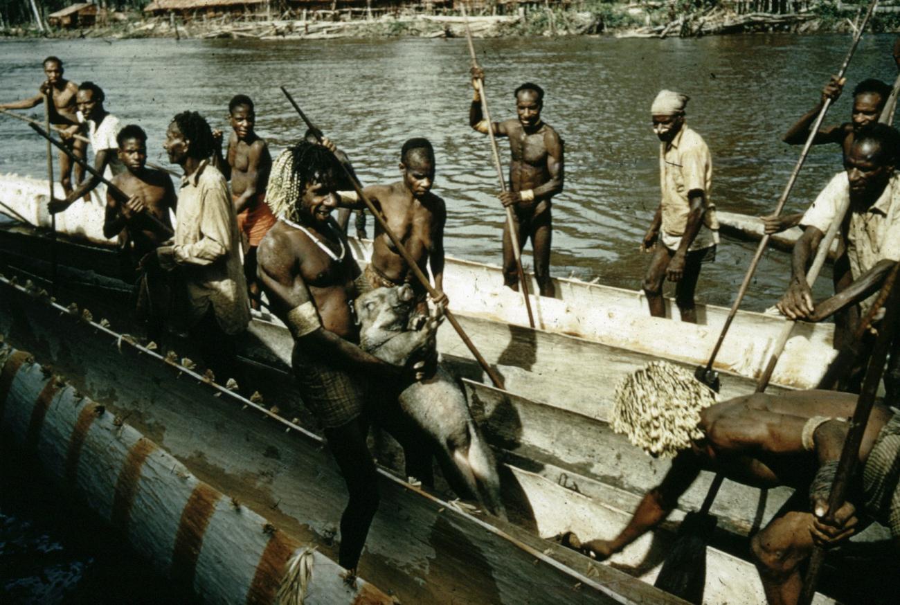Mannen uit het Asmatgebied vervoeren varkens in prauw