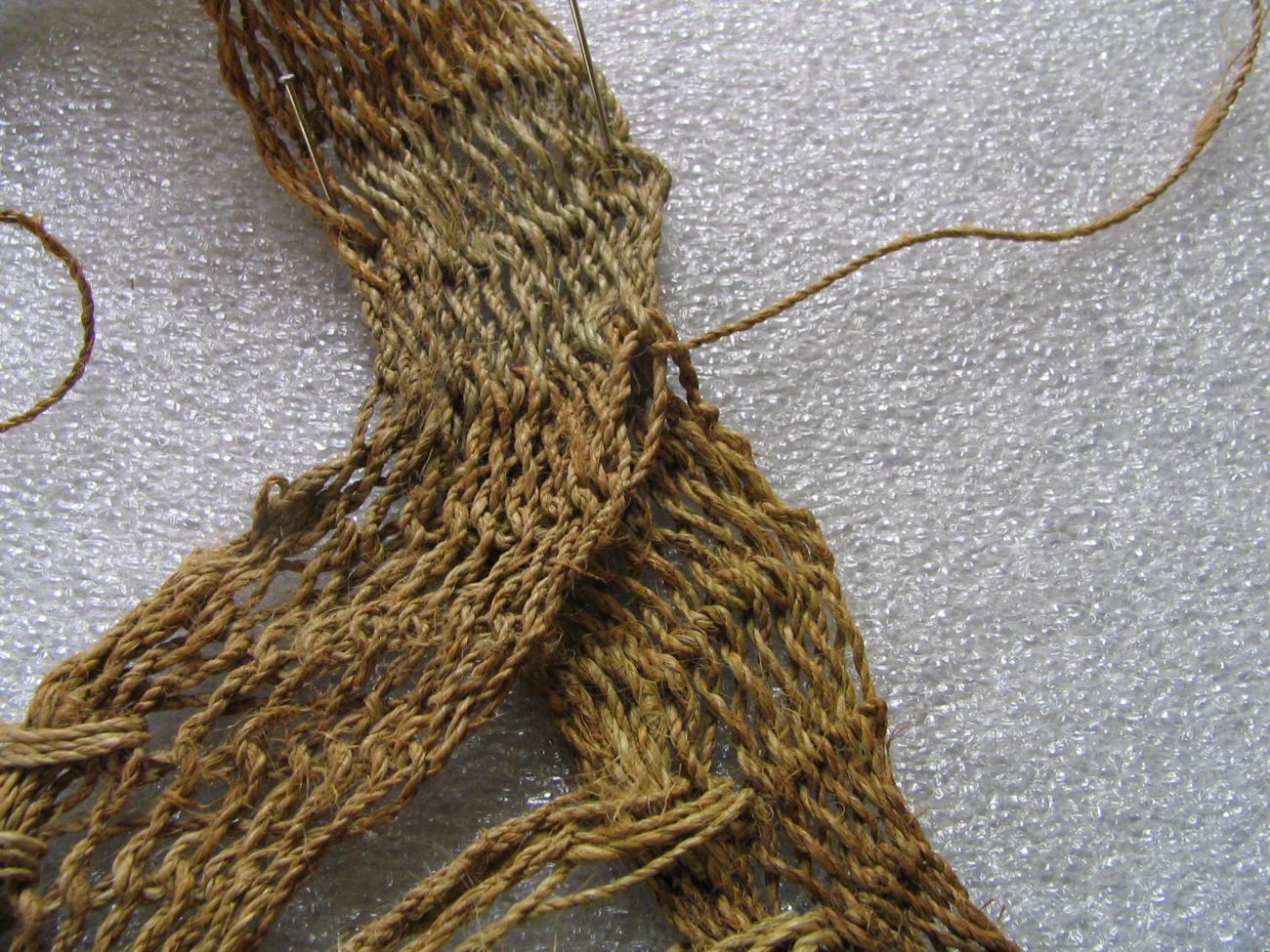 De rand (2 cm) en draagband zijn apart van de grote vorm gemaakt en later zijn die aan elkaar gezet met een siersteek die bestaat uit een lange verbindingslus waarvan de twee draden tussen de rand en de grote vorm 8 tot 10 keer om elkaar zijn gedraaid. De grote vorm is in zandloperlussen (figure eight looping) die verschillen van grootte. Er is waarschijnlijk niet met een maatreep gewerkt. Er is onderaan om een hulpdraad begonnen en in het rond gewerkt tot de gewenste lengte. De onderkant is dichtgemaakt met een sierlussteek. De rand en band zijn ook in zandloperlussen en volgens een bijzonder patroon gevormd. Waarschijnlijk is het midden van de draagband het begin.