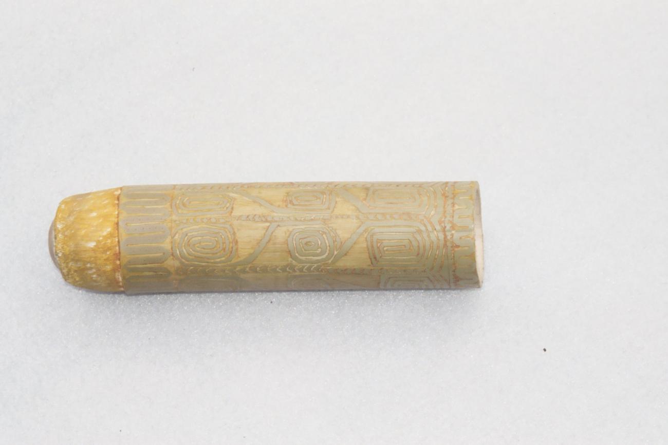De hoorn is gesneden uit een deel van een geleding van een bamboestengel met aan een zijde een knoop, die is doorboord en bijgesneden is tot mondstuk. De andere zijde is recht afgesneden en open. Het patroon is ondiep en enigszins rafelig ingesneden. De bamboehuid is nog groenig. Het verdiepte gedeelte is ingewreven met een donkergele kleurstof.