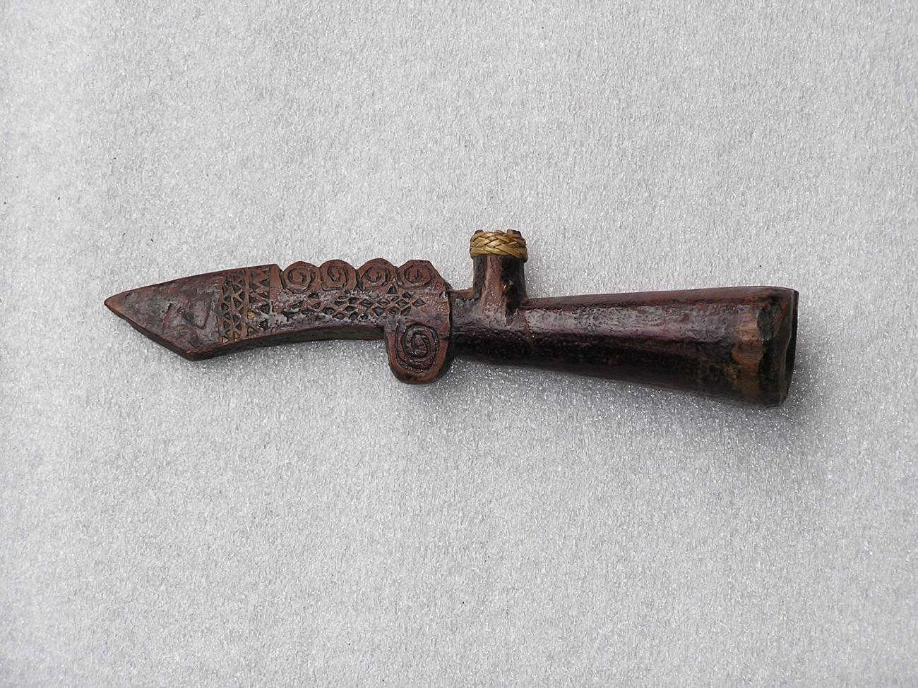 Zeskantige kop, de platte staart is ingesneden met spiraalvormige figuren. De uitstulping voor bevestiging van het mondstuk is omwonden met rotan.