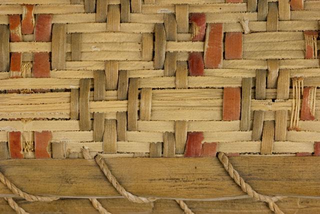 Gevlochten en gekleurd pandanusblad en orchideeënvezel. De verbindingen zijn verstevigd met extra pandanusblad en bastvezelkoord.