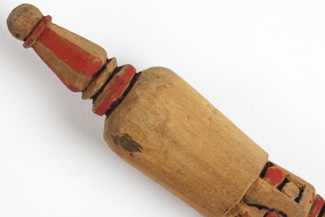 De steel is aan de top uitgesneden in de vorm van een korwarbeeldje en daaronder met reliëfhoutsnijwerk versierd. Het geheel is met rode en zwarte kleurstof verder versierd. De lengte van de versiering is 12 cm. De lengte van het lepeldeel is 10 cm. Doorsnede steel: 2 cm.