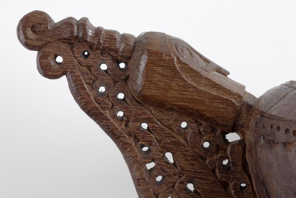 De schaal is gemaakt van vrij zwaar hout. Hij bestaat uit een vrij diepe kom met daaraan vast twee bewerkte vleugelvormige handvaten. Het geheel is met houtsnijwerk versierd: de "vleugels" van de handvaten met ajourhoutsnijwerk, de schaal en de rest van de handvaten met reliëfhoutsnijwerk. De bovenkant van de handvaten zijn in de vorm van een korwarkop uitgesneden. Langs de rand van de ovale schaal zijn gaatjes geboord en hierin zijn stukjes hout van een zwarte kleur gestoken. Er zijn 4 stukjes hout weg. De schaal staat op een ronde houten ring, die overgaat in de vleugels van de handvaten. Er zijn lijmsporen te zien tussen de sokkel en de bak, maar het geheel geeft toch wel de indruk uit één stuk hout gesneden te zijn. Zo niet, dan zouden de sokkel en de vleugels er later aangeplakt moeten zijn. Maar dat lijkt niet waarschijnlijk. Maten: Lengte: bak: 17 cm. Bak + oren: 40 cm. Hoogte: Bak: 8 cm. Bak + voet: 10 cm. Handvat: 14 cm. Voetring: 1,5 cm. Verbinding voet-bak: 0,5 cm. Doorsneden: opening bak: 11 cm. x 12 cm. Voetring: 8,5cm.x9cm. Opening v oetring: 6 cm. Breedte rvoetring: 1 a 1,8 cm.