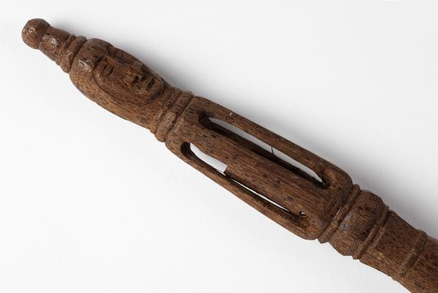 De sagoklopper is gemaakt van roodbruin, middelzwaar hout. De top is in de vorm van een figuurtje met twee hoofden gesneden. Het lijf van het figuurtje is opengewerkt en bestaat uit 4 kolommen. In e uitgesneden lijf bevindt zich een 3 cm. lang cilindertje, dat los heen en weer kan bewegen. De figuur staat op een klein sokkeltje dat uit twee kolommetjes bestaat met daartussen, boven en onder 3 uitgesneden ringen. Onderaan , op 12 cm. van de onderkant, bevindt zich een stuk van 17 cm. dat met reliëfhoutsnijwerk is versierd. De onderkant van de klopper heeft een ringvormige holte. Maten: Lengtes: klopper: 67 cm. Figuur: 12,5 cm. Hoofd totaal: 6 cm. Hoofdtooi: 2,5 cm. Lijf: 6,5 cm. Sokkeltje: 3 cm. Twee delen van de sokkel resp. 1 cm. en 1,5 cm. lang. Reliëfhoutsnijwerk: van onder naar boven: Lengte: 4,5 cm. met ringvormige gesneden motieven. Dan 1,5 cm. bestaande uit een ring van rondjes met daarboven nog twee ringen. Vervolgens een stuk van 8,5 cm. dat versierd is met verticaal aangebrachte motieven. Daarna weer een stuk van 2,5 cm. met ringvormig aangebrachte versieringen. Deze bestaan uit 4 gedeelten: een ring met schuine strepen, een gladde, dunne ring, een ring bestaande uit rondjes en tot slot een stukje reliëfhoutsnijwerk met ringvormig aangebrachte motieven, zoals die in het verticale en het eerste horizontale deel zijn aangebracht. Doorsneden:onderkant: 3 cm. Hierbinnen zit een uitgeholde ring met daarbinnen een eilandje met een doorsnede van 1,5 cm. Breedste deel klopper: 4 cm. doorsnede. Figuurtje van 1cm. naar 3 cm.
