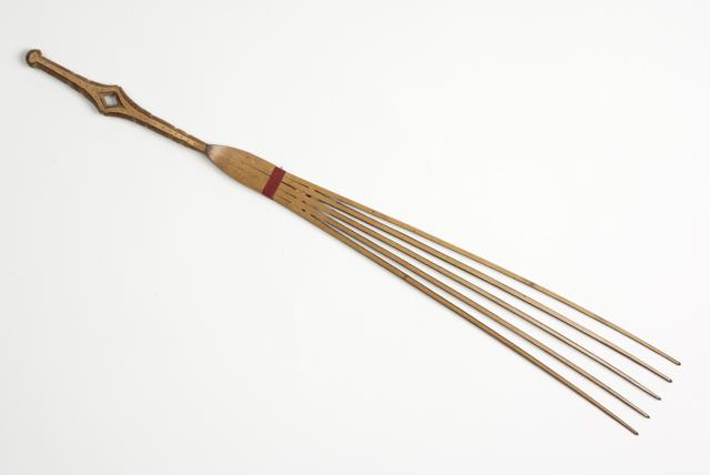 De kammen zijn gemaakt van bamboe. Twee stuks. Ze hebben allebei 5 tanden en tussen de tanden, vlak bij het handvat zitten stukjes hout/ bamboe geklemd om de tanden uit elkaar te houden. Ca. 1 cm. hiervoven bevindt zich een stuk gewonden draad van ca. 1 cm. breedte. Bij kam 1 is dit windsel van rood garen gemaakt, bij kam 2 van wit katoendraad. Aan de achterkant past het windsel tegen het handvat aan, dat iets uitsteekt boven het kam gedeelte. Kam 1 is 42 cm. lang en heeft een handvat van 11,5 cm. legte. Op 5,5 cm. van het einde van de kam zit een vierkante opening, als ruit geplaatst. Boven deze opening zit nog en stuk van 5 cm. Dit stuk loopt uit in een knop. Op de plaats van de opening is het handvat breder dan onderaan en bovenaan: 2 cm. De dikte van het handvat is verder ca. 0.8 mm. De voorkant van dit handvat loopt aan de voorkant spits toe, aan de achterkant is het plat afgewerkt ( ca.3 mm. breed). Breedte tandgedeelte:ca. 5 cm. Breedte bovenkant kam: ca. 1.5 cm. Kam 2 is 42,5 cm. lang. Het handvat meet 13,5 cm. en bestaat uit 3 in elkaar grijpende schakels. De schakels zijn gesloten en dus uit het bamboe uitgesneden. Breedte van de schakels: ca. 1,3 cm. Breedte tandgedeelte: 7 cm. Breedte bovenstuk kam: 2 cm.