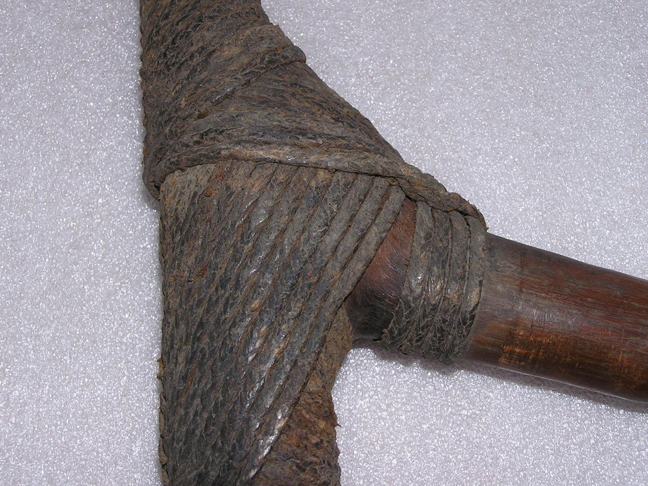 Dissel met houten steel en zwart/groene stenen bijlkop. Het gedeelte van de bijl waaraan de kling bevestigd is, is omwikkeld met grof gevlochten bastvezeltouw. De structuur van de steel is glad en gedeeltelijk gespleten over de lengte.