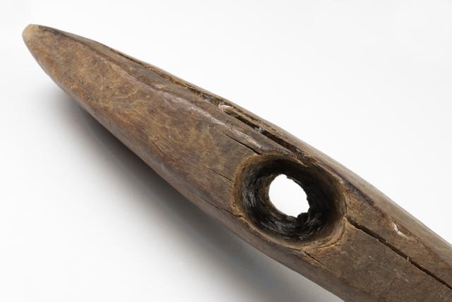 Een bijl van hout met in het bovenste brede deel een gat waarin het smalste uiteinde van de stenen bijlkling is geschoven en geklemd. Het bovenste brede deel van de steel vertoont enkele scheuren.
