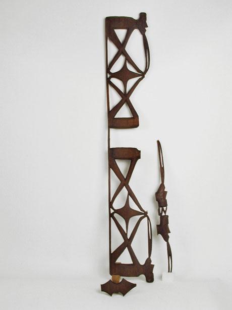 Opengewerkt donkerbruin gesneden paneel, voorstellende twee tegenoverelkaar zittende mensenfiguren.Op de handen van de vier mensenfiguren rusten de snavels van vogels. Tussen de handen en voeten is een ster uitgesneden.