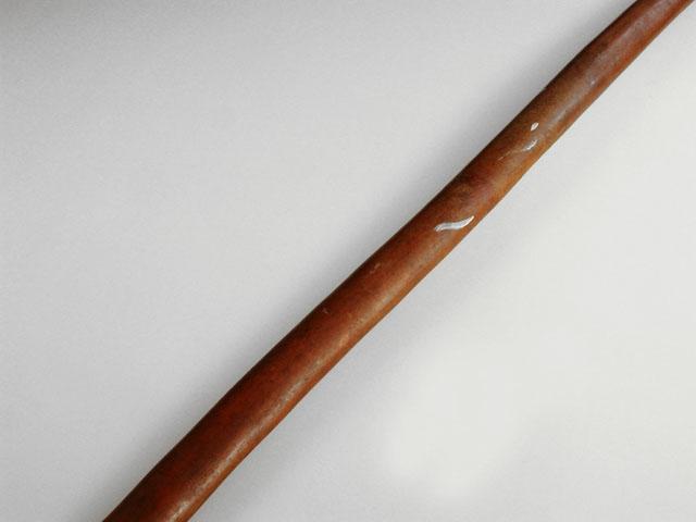 Boog zonder pees van rode houtsoort. Bij beide punten zitten verkleurde plaatsen waar een verbinding om heeft gezeten. Vertoont sporen van witte verf. Zwarte vlekken. Midden van boog zit een small richel/spleet.