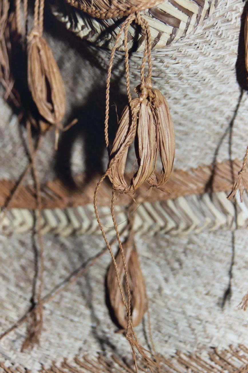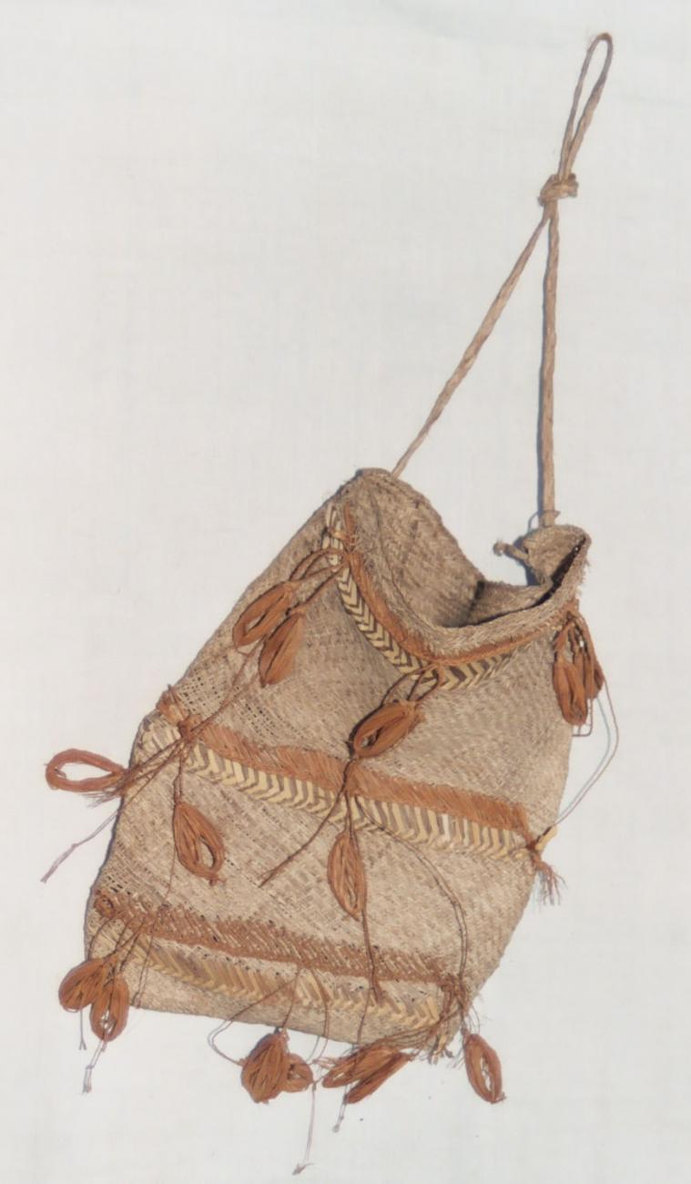 Een gevlochten tas voor het vervoer van persoonlijke bezittingen, zoals rook- en pruimbenodigheden. Aan de voorzijde is de tas versierd met drie randen in verschillende kleuren palmblad en kwastjes en koordjes van sagonerfbast. Het hengsel loopt aan de achterzijde kruislings door.