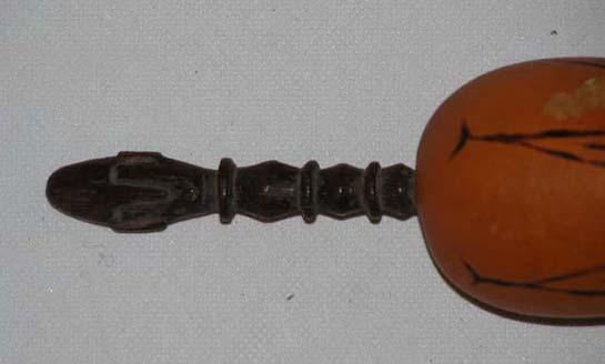 Houder met spatel of likstok. Voor het bewaren van kalk dat gebruikt wordt bij de sirih- of betelpruim. De houder is versierd met aan de oppervlakte uitgesneden, zwartgekleurde spiraalmotieven. Met het likstokje wordt tijdens het pruimen naar smaak, steeds wat kalk toegevoegd. De bovenzijde van het likstokje is versierd met een uitgesneden mensenkopje.