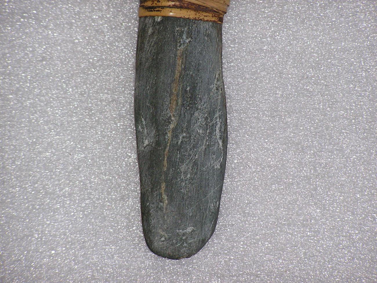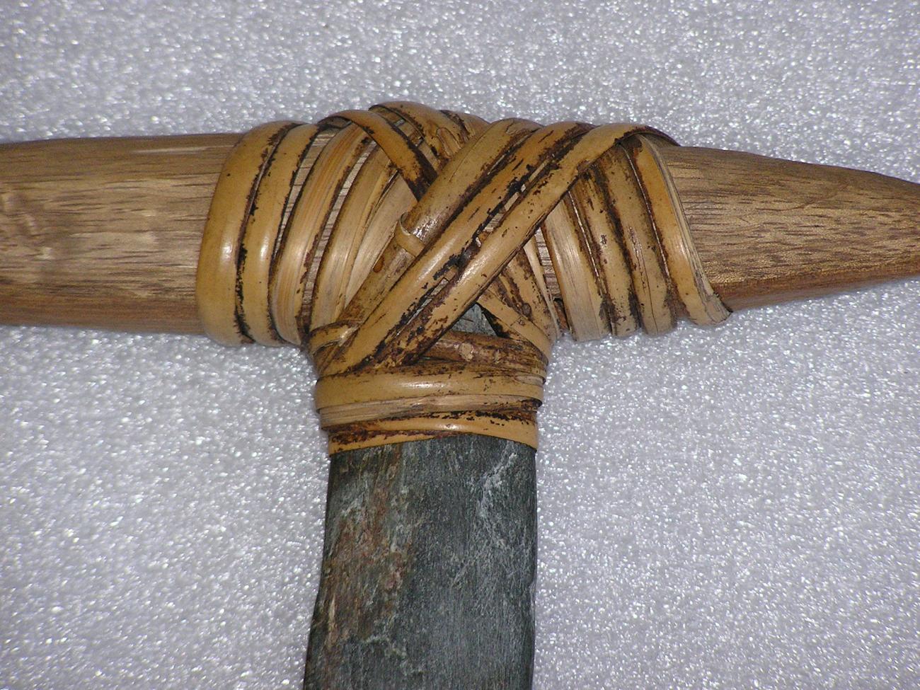 De stenen bijlkling is loodrecht gestoken in de houten steel en vastgesnoerd met rotan repen.