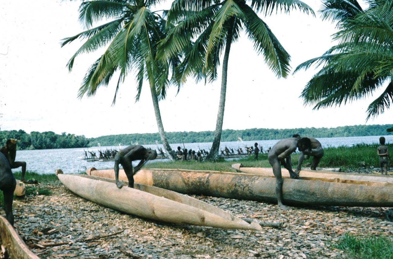 Nederzetting in waterrijk gebied - Mannen zijn bezig met het bewerken van boomstammen tot kano's