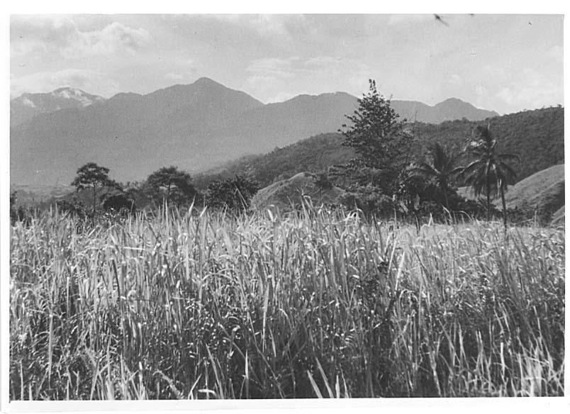 landschap 2 - Op de voorgrond een veld met hoge grassoort. Achtergrond hoge bergtoppen. Daartussen nabij gelegen beboste berghelling.