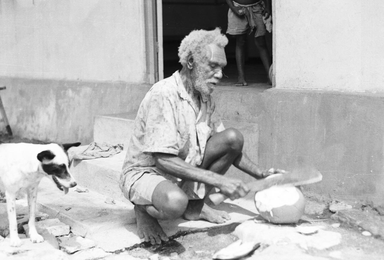 Papoea-man opent een kokosnoot onder toezien van een hond