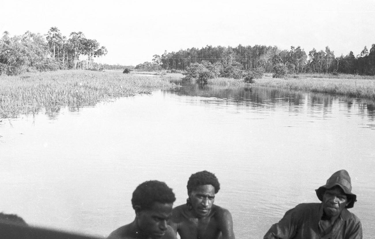 Tocht Merauke-Kepi-Cook: Uitzicht over het water en riet met Papoea's op de voorgrond