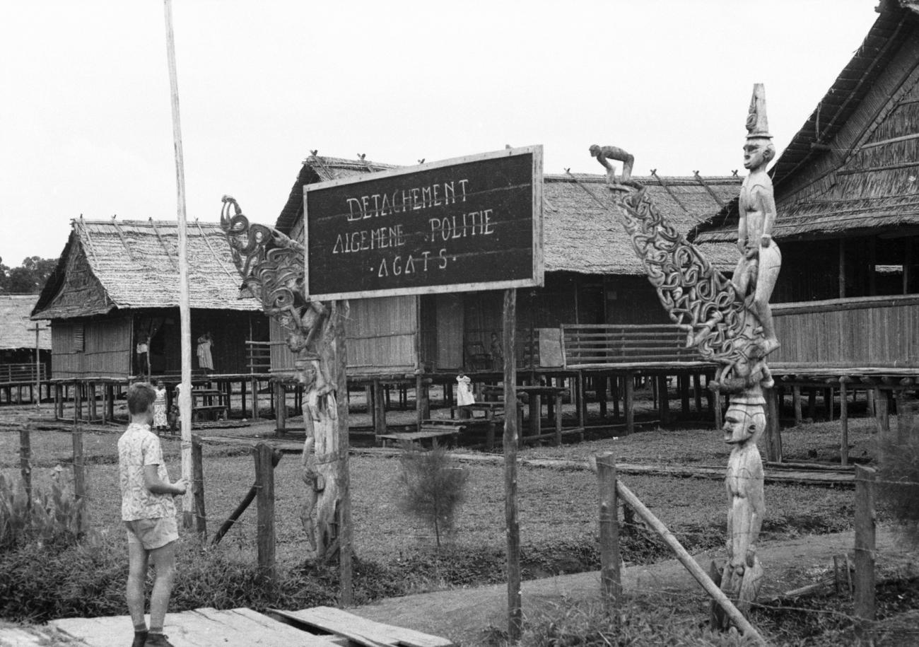 Ingang van de politiepost te Agats, geflankeerd door Bisj-palen