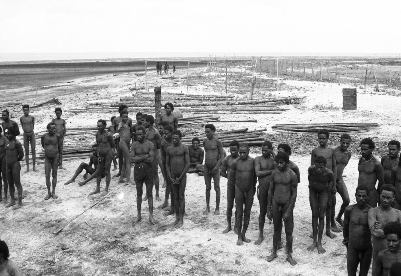 Groep Papoea-mannen (Asmat) aan de kust