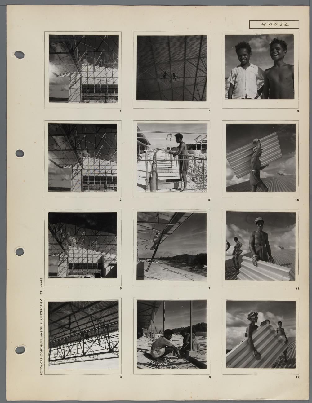 Bouw loods - Foto 1 t/m 5 : zicht op dakconstructie van op te trekken gebouw (loods) Foto 6 : betonvlechter bezig met vlechten van wapening. Foto 7 en 8 : werkzaamheden aan buitenzijde gebouw (dakoverstek en t.p.v. fundering van kolommen). Foto 9 : twee vrolijk lachende Papoea-jongens aanwezig op de bouwplaats. Foto 10 t/m 12 : leggen van golfbeplating als dakbedekking