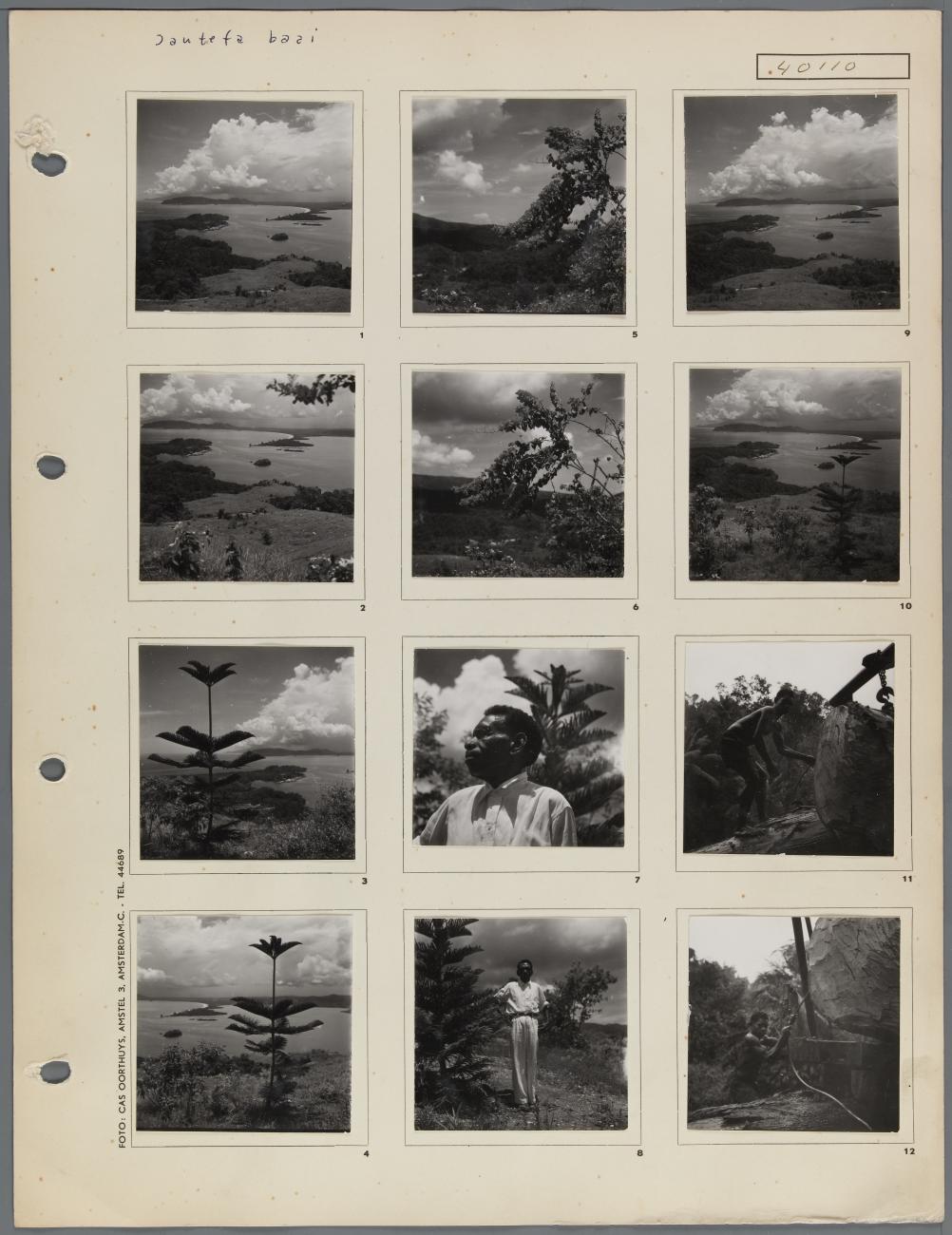 Hollandia, Jautefabaai - Foto 1 t/m 6, 9 en 10 : zicht op de Jautefa baai. Foto 7, 8 : Papoea-man, westers gekleed met bril.Foto 11, 12 : Papoea-jongeman bezig met aanbrengen van takel aan omgehakte boom(stam) ten behoeve van transport.