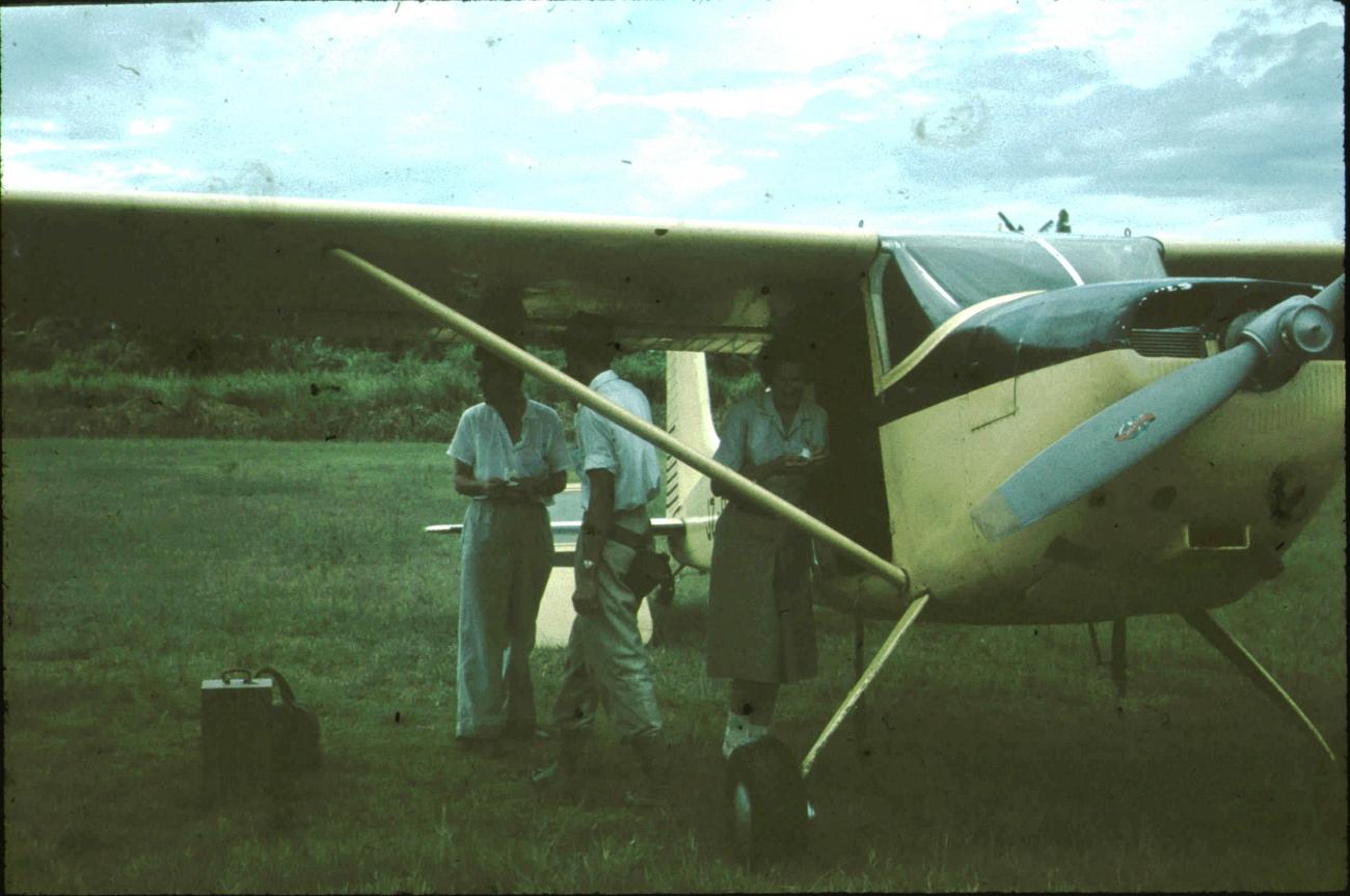 Passagiers bij klein vliegtuig.
