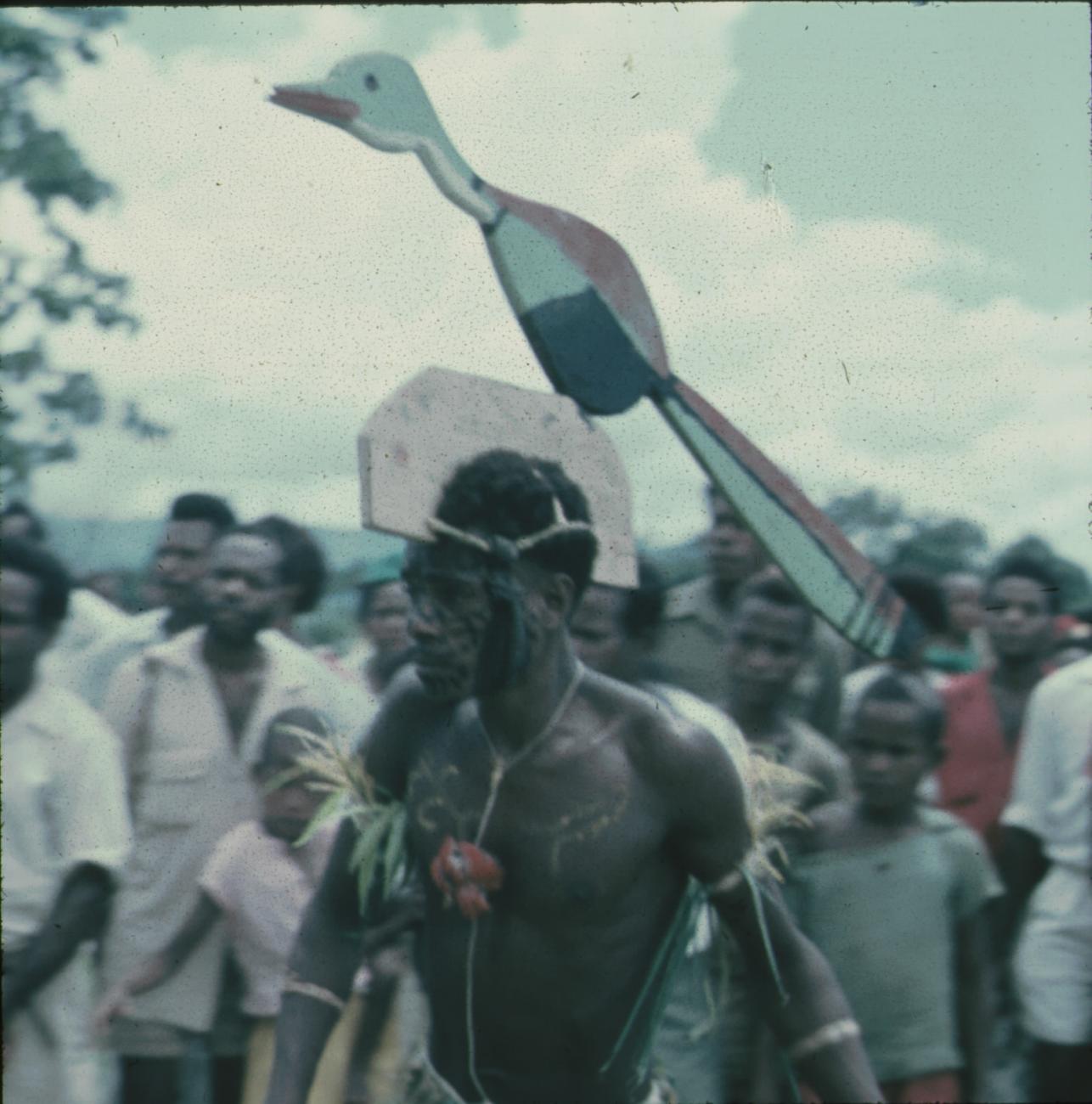 Krijger met houten paradijsvogel op z'n hoofd