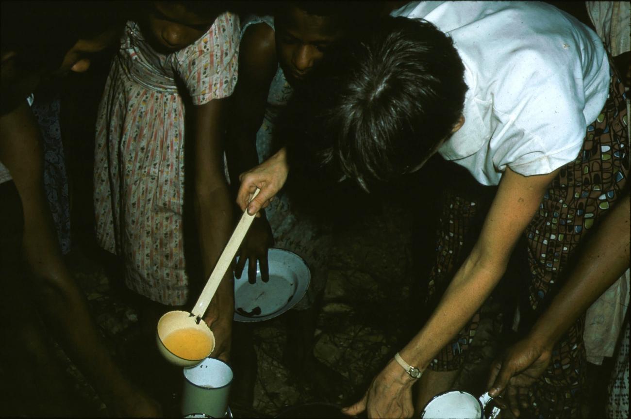 Onderwijzeres deelt soep uit.