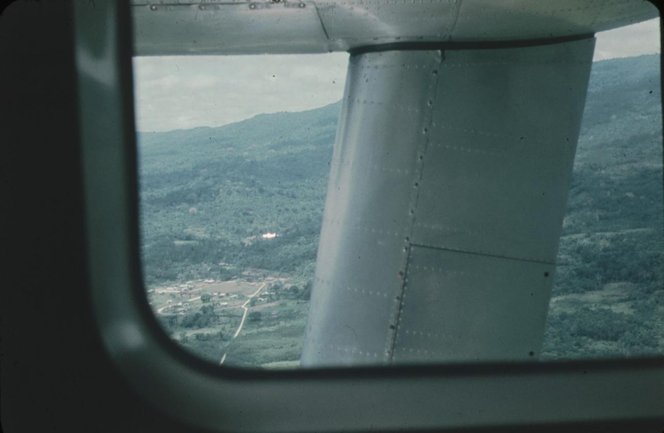 Foto vanuit vliegtuig van wegen en bebouwing.