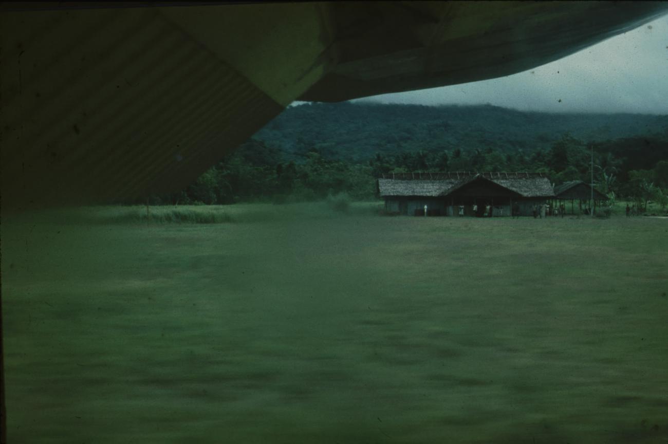 Foto vanuit vliegtuig van gebouw bij landingsbaan.