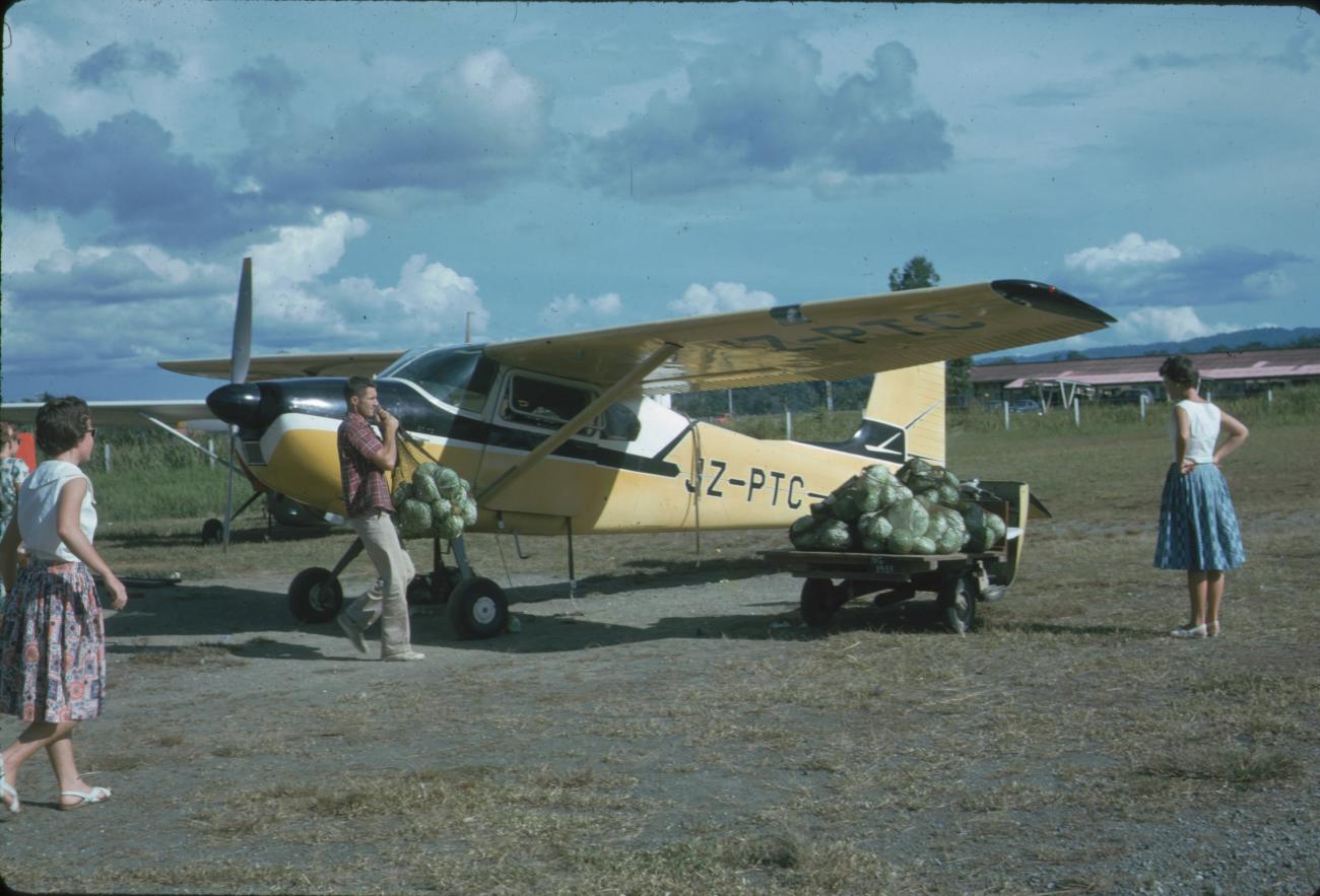 Vliegtuig op landingsbaan, vruchten?? die worden ingeladen.