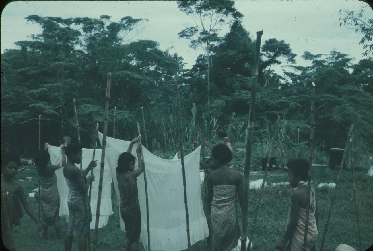 Meisjes wassen muskietennetten.