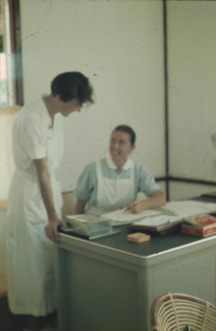 Twee verpleegsters bij een bureau.
