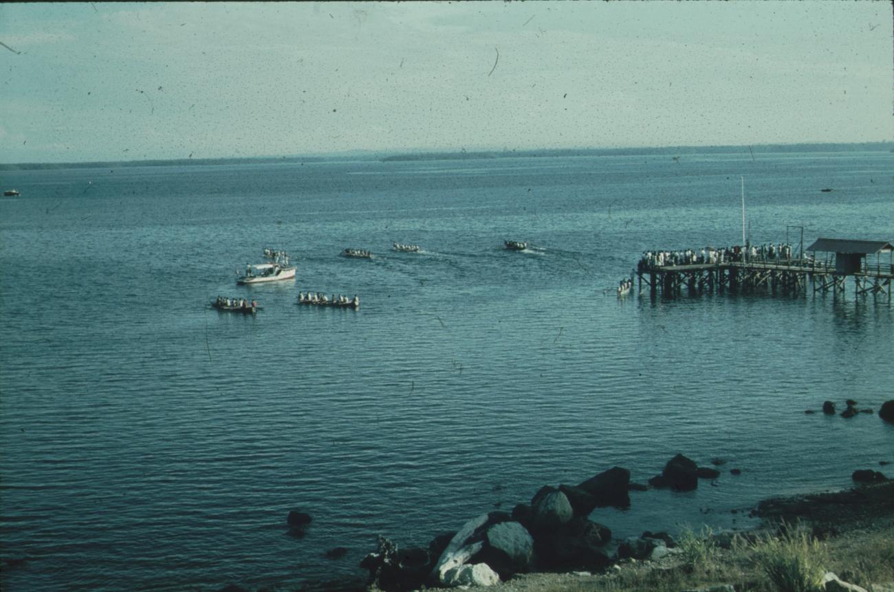 Aanlegsteiger met mensen, prauwen en schip in baai.