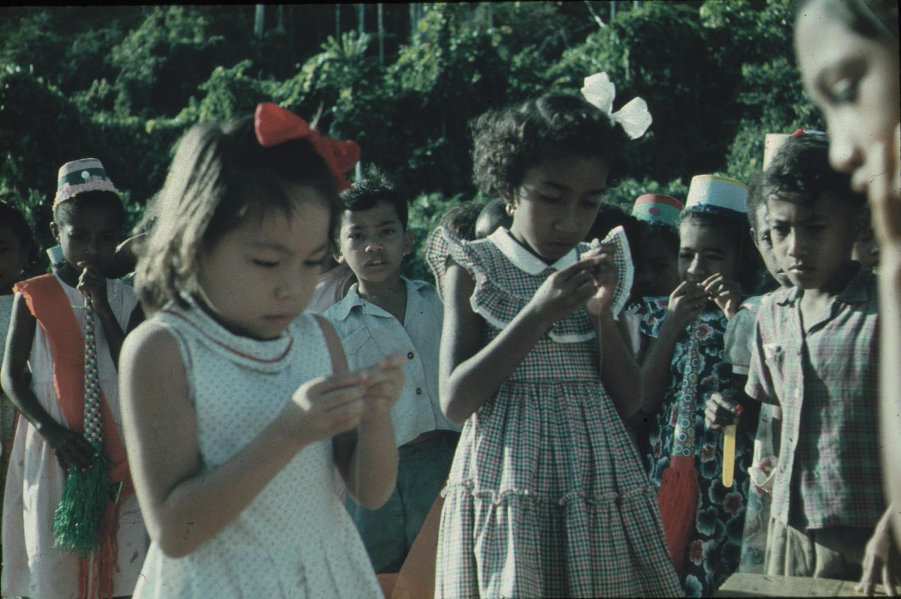 Koninginnendag, schoolkinderen met mutsen en toeters.