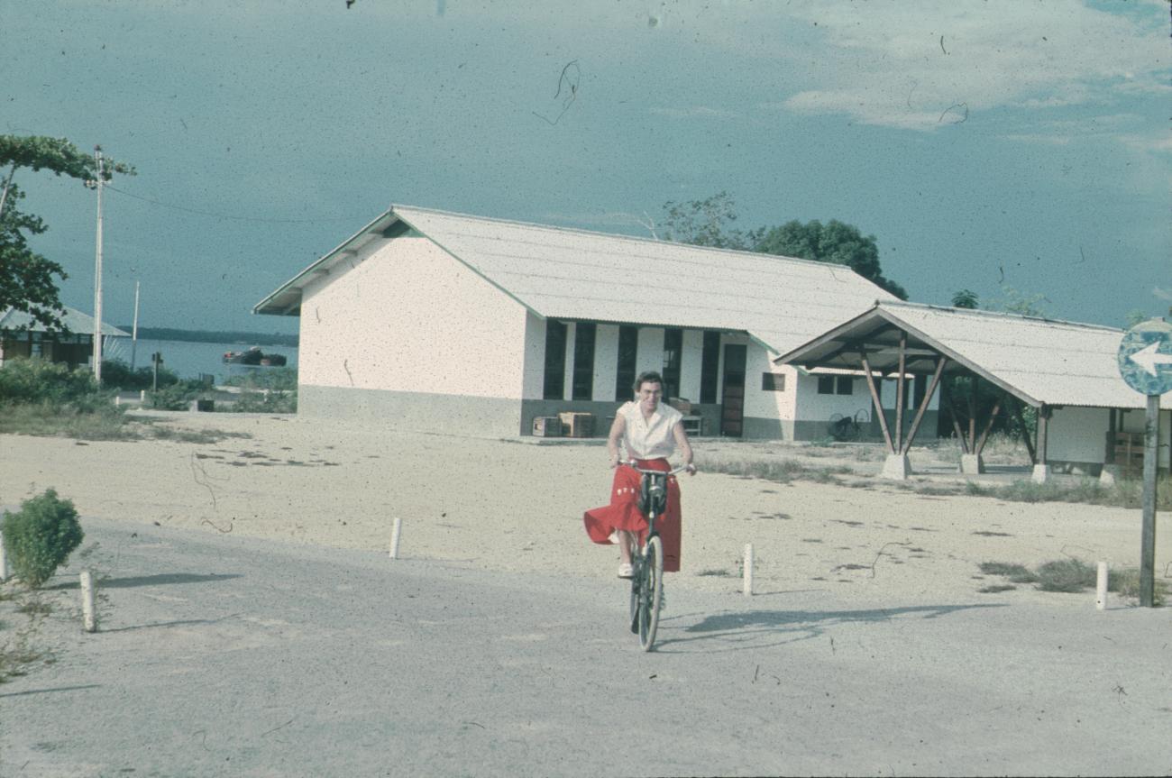 Westerse vrouw op fiets, gebouwen op achtergrond.