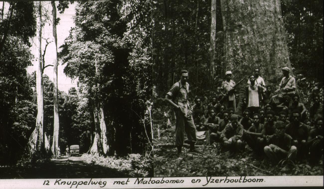 Knuppelweg met Matoabomen en groep arbeiders en bewakers voor IJzerhoutboom Objectcode BD/186/79 Beschrijving boom, geweer, arbeider, bewaker Technische details Afbeeldingsoort Diapositief Terug naar overzicht