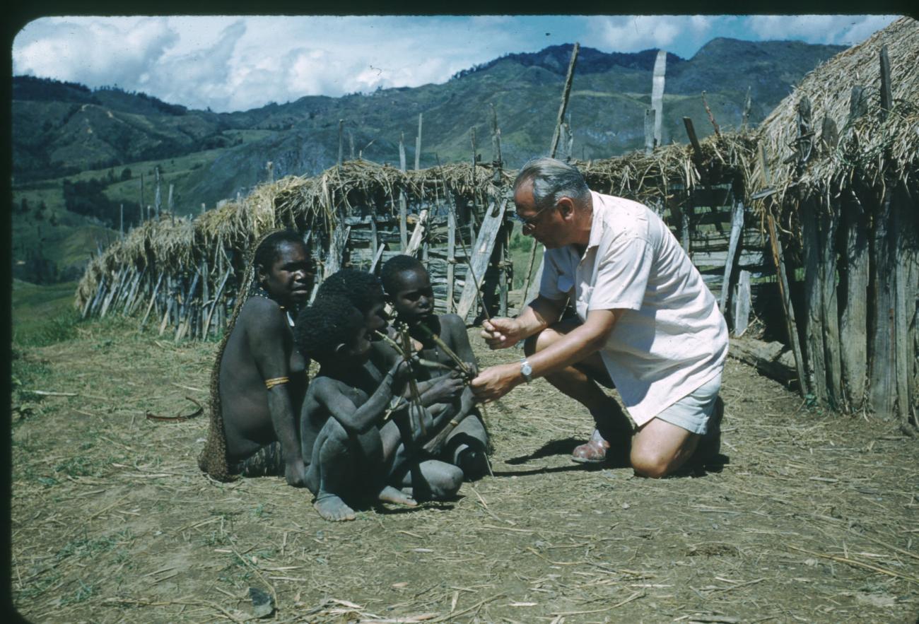 Papoea vrouw met kinderen die pijlen laten zien aan blanke man