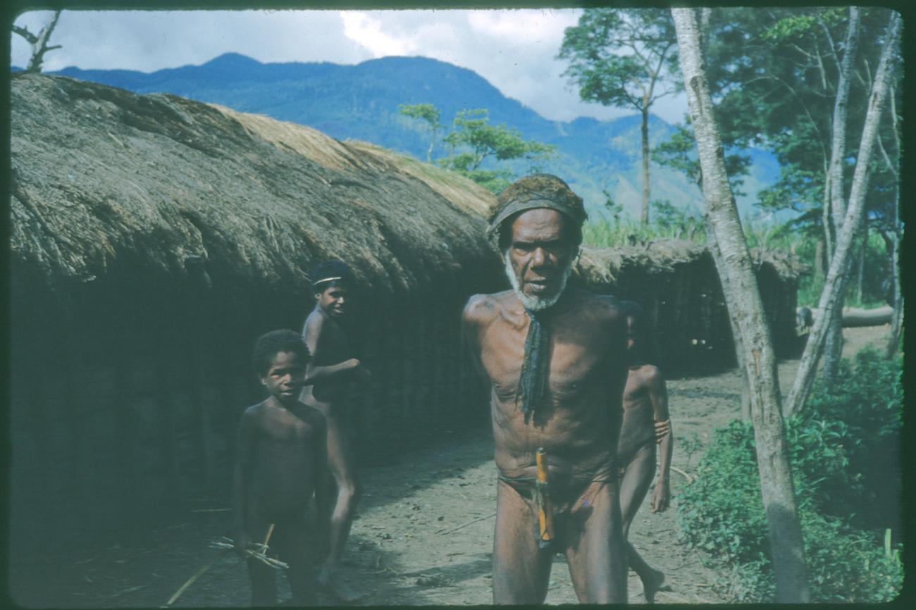 Oude man in nederzetting - Man met baard en kinderen erbij