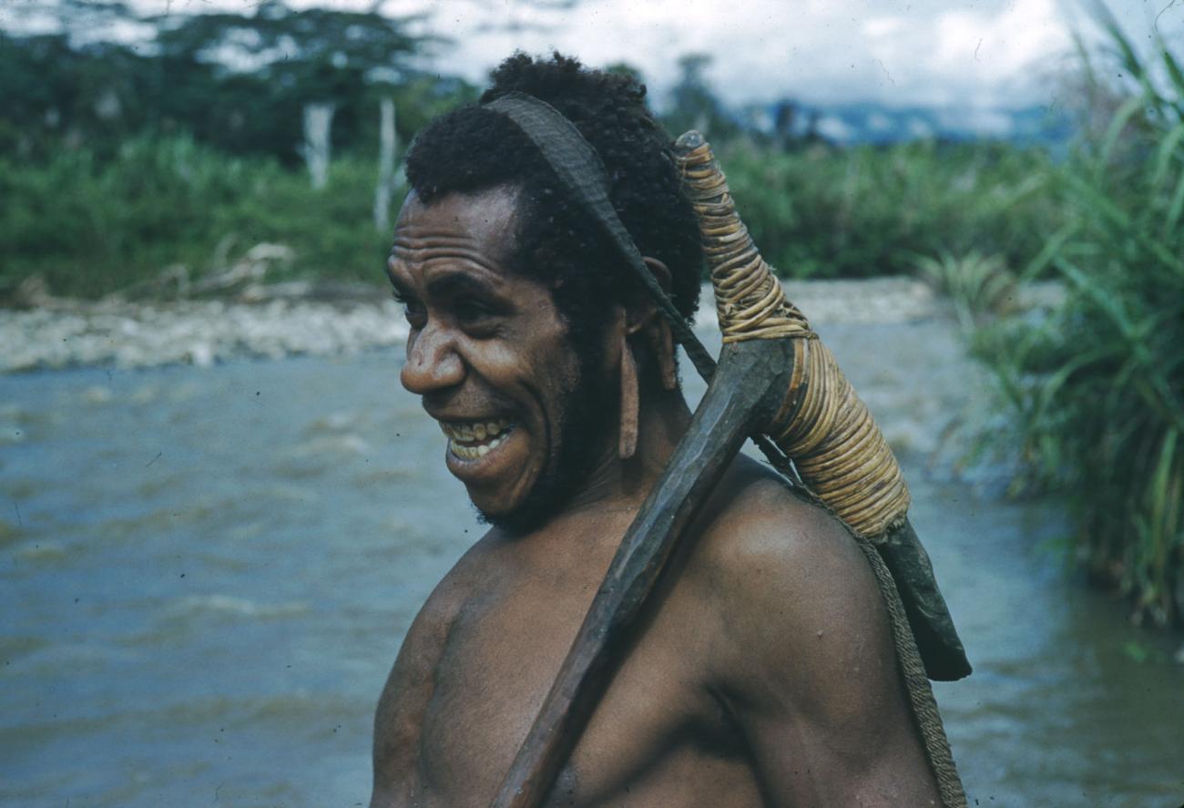 Man met dissel - Man met stenen bijl heeft een draagband om zijn hoofd en een uitgescheurde oorlel