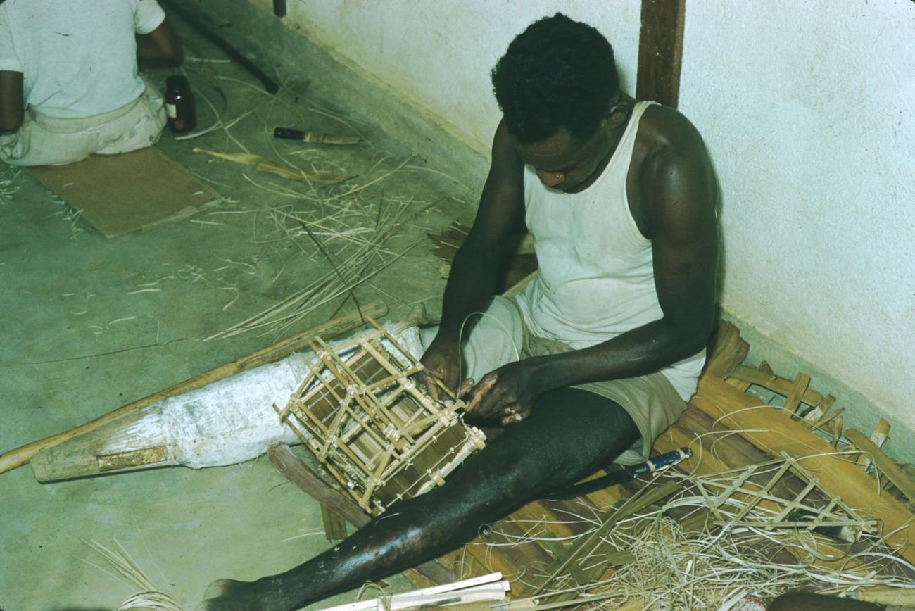 Man maakt speelgoedhuisje - Man met houten been maakt speelgoedhuisje