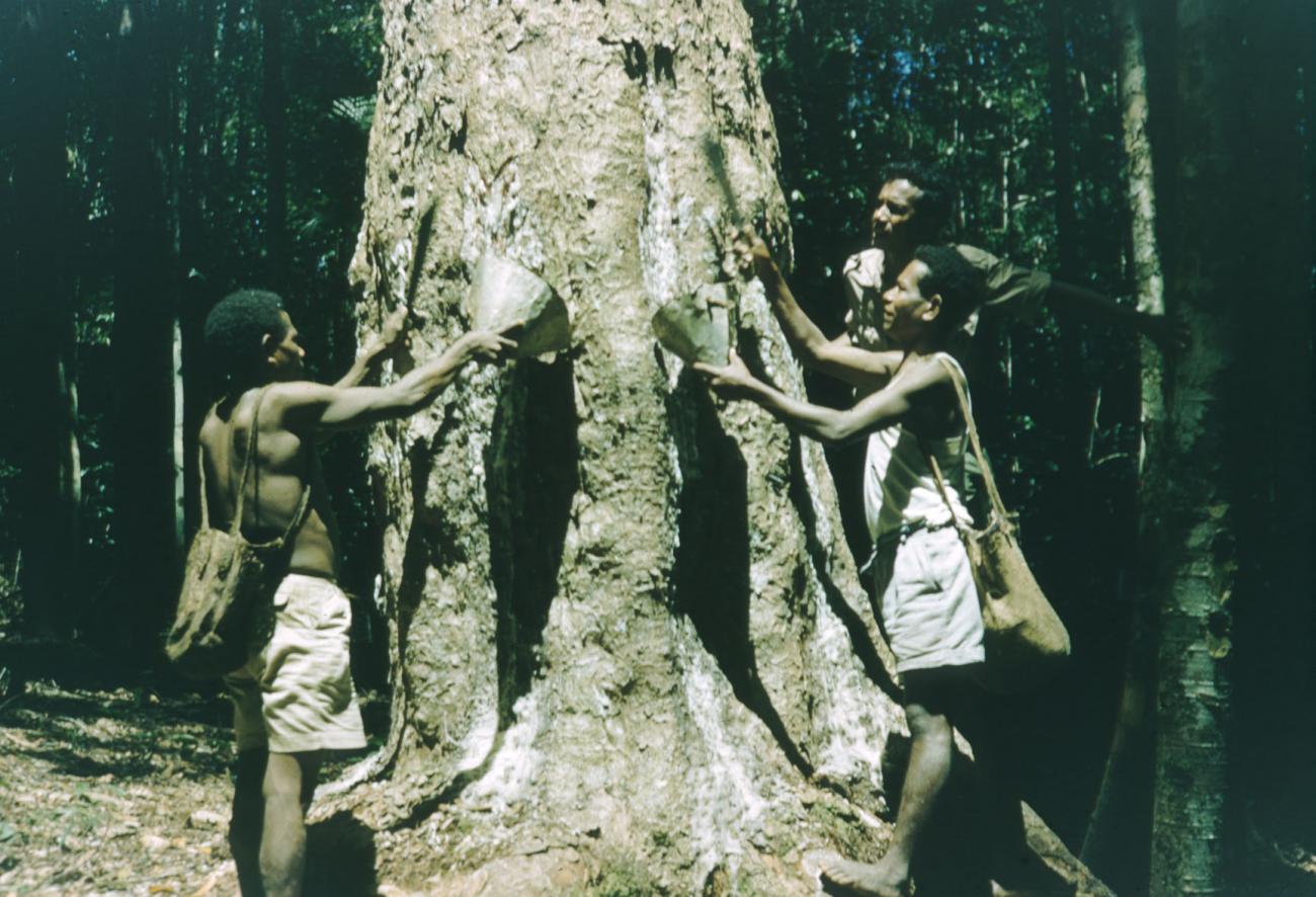 Copalhars van Agathisboom - Mannen vangen natuurhars op met trechters